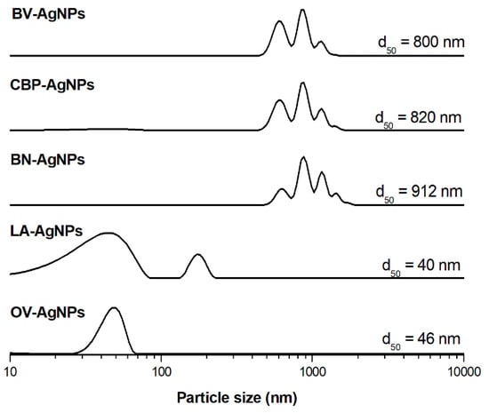 In order to investigate the effect of the material responsible for the reduction from different plants and its interaction with the formed AgNPs, the ZP and PCCS measurements were performed. The results are presented in Table 6 and Figure 3, respectively. The individual nanoparticles are prone to forming agglomerates or, at least, to being connected to larger grains by the residual organic matrix from the plant extracts. These grains can be registered also by the PCCS method, and the stability of the prepared suspensions can be estimated by ZP measurements.
