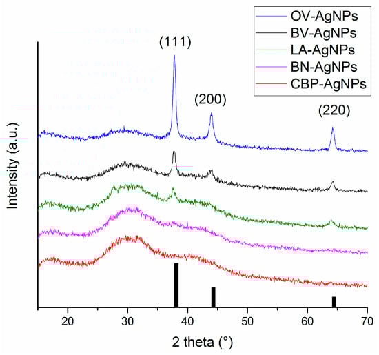 The XRD patterns of the powders obtained after centrifugation are provided in Figure 4. The reflections corresponding to elemental silver have been found in just three out of five products. Namely, the presence of elemental silver in the solid residues after centrifugation is undeniable for OV-AgNPs, BV-AgNPs and LA-AgNPs. For these systems, the largest crystallite size was determined from TEM (Table 5), and the SPR peak could be well-identified in Figure 1i,j. For the systems where the produced nanoparticles were apparently smaller (CBP-AgNPs and BN-AgNPs) with average crystallite size below 20 nm according to TEM (see Figure 2a and Table 5) and the SPR peak hardly found (Figure 2c–f), the reflections corresponding to elemental silver are absent. As the produced nanoparticles in these cases are very fine, it is highly probable that a significant amount of them were dispersed in the supernatant and remained there despite intensive centrifugation and, thus, could not be detected in the solid residue. Moreover, smaller NPs exhibit much broader and diffuse peaks, so their signal also might have been lost in the noise in the last two cases.