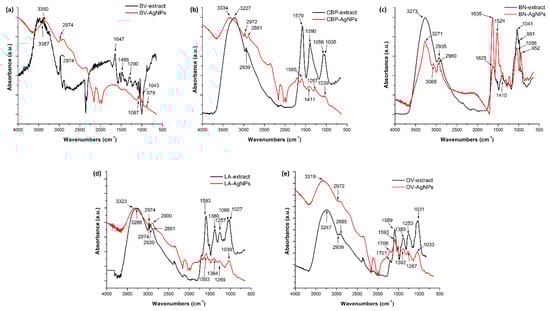 Attenuated total reflectance (ATR)-FTIR absorption spectra of plant extracts and synthesised AgNPs from 5 mM AgNO3, (a) BV-AgNPs, (b) CBP-AgNPs, (c) BN-AgNPs, (d) LA-AgNPs and (e) OV-AgNPs.