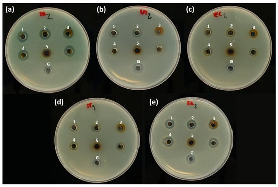 Petri dishes showing the antimicrobial activity of 1. BN-AgNPs, 2. BV-AgNPS, 3. LA-AgNPs, 4. CBP-AgNPs and 5. OV-AgNPs prepared from 5 mM AgNO3 and gentamicin sulphate (G) on (a) P. aeruginosa, (b) L. monocytogenes, (c) E. coli, (d) S. enterica ser. Typhimurium and (e) S. aureus.