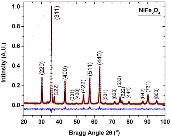 The pattern was refined using Rieveld analysis, which revealed the single-phase nature of the sample, and a good fit between the theoretical pattern (the continuous black line) and the experimental pattern (red circles) with a horizontal line representing the difference curve (continuous blue line). The refined lattice parameter was found to be: a = (8.347 ± 0.007) Å. This value is in good agreement with the value of 8.34 Å reported for bulk Ni ferrite [54].
