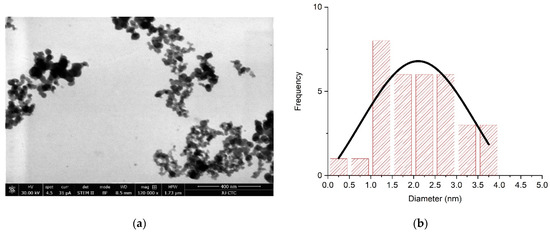 Based on the values we obtained from the TEM, the size of the synthesized particles was 2.5–5 nm. The structure and morphology of the synthesized nanoparticles are shown in the FESEM and TEM images (Figure 2 and Figure 3). The particle size distribution obtained from the TEM image was dominated by particle sizes between 2 and 5 nm (Figure 2b).