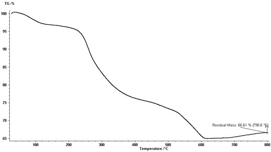 The TGA curve consists of the following three stages (Figure 4). The first stage (temperature range 50–150 °C) is due to the initial breakdown of the complex and evaporation of the absorbed water. The spontaneous combustion is caused by interactions of organic compounds in the plant extract gel with liberation of H2O, CO2, and some NOx [25,26,27]. The second region (250–500 °C) is attributed to further oxidation of the organic matter and decomposition of inorganic salts, which has two degradation mechanisms involving both intramolecular and intermolecular transfer reactions [28,29,30,31]. The third stage (600–800 °C) is due to the formation of the corresponding metal oxide. When the temperature was increased beyond 640 °C, no weight loss was observed, indicating that NiFe2O4 oxide was formed.
