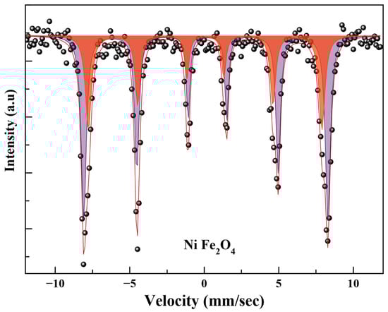 The Mössbauer spectrum of the Ni-ferrite (Figure 7) clearly shows a magnetically split spectrum, indicating magnetically ordered spins of the iron ions, which is consistent with the magnetic results. The asymmetric absorption lines indicate that the iron ions occupy sites with different chemical environments. The spectrum was best fitted with two magnetic sextets, corresponding to iron ions at tetrahedral and octahedral sites. The hyperfine fields (491 and 513 kOe) and center shifts (0.18 and 0.27 mm/s) of the tetrahedral and octahedral components, respectively, indicate that iron ions were Fe3+ in both sites [58]. The observed relative intensities of 38:62 for the tetrahedral-to-octahedral sub-spectra indicate that the sample was a mixed spinel, with a degree of inversion of 0.24. Accordingly, the distribution of cations in the sample was consistent with the formula (Fe0.76Ni0.24)[Fe1.24Ni0.76]O4, where the round brackets refer to the tetrahedral (A) site, and the square brackets refer to the octahedral [B] site. The distribution of iron and divalent nickel ions at the tetrahedral site was shown to depend on the pH value of the solutions used to prepare Ni-rich spinel ferrites, and the observed distribution is in agreement with that observed in Ni-rich ferrites prepared at pH = 8 [58].