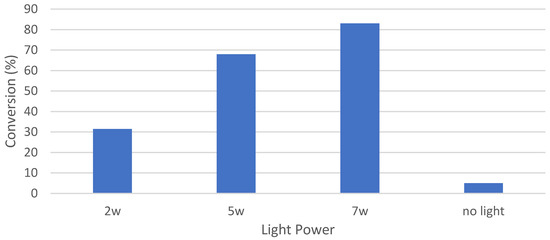 When the irradiation time was 2 h, the conversion of VAL was 14% (Figure 12). By prolonging the irradiation time to 6 h, the conversion to VN increased to 83%. When the reaction time was prolonged to 12 h, there was no increase in the VN conversion and the selectivity decreased. This was due to acid formation and other by-products obtained, such as aldol condensation. Therefore, 6 h was the optimum reaction time to obtain the highest reactivity and selectivity for VN. Upon applying LED light, the reactivity was about five times more than in the absence of light (Figure 13). When the LED’s power was 7 W, the photocatalytic reaction had its highest rate and about 80% VN was produced. The light intensity has an effect on the photocatalytic reaction via exciting the valence electrons to the conduction band [61,62,63,64,65].