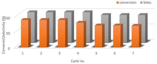 A unique property of heterogeneous catalyst is its recyclability [66,67,68,69,70]. Therefore, we investigated the recyclability by using VAL as a substrate in the presence of 10 mg of the catalyst under the optimized conditions.