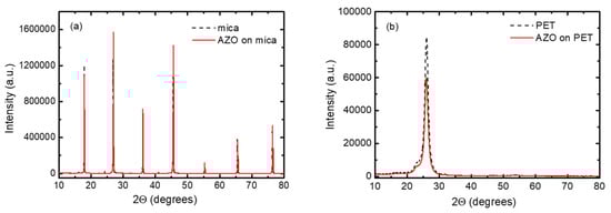 XRD of (a) AZO on mica and (b) AZO on PET (blank mica and PET are included as references).