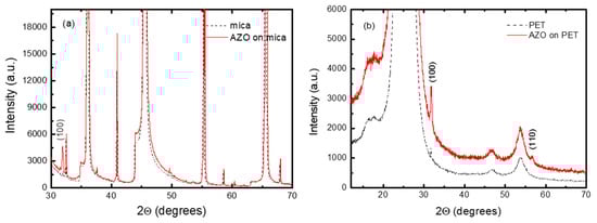 Detailed XRD patterns of (a) AZO on mica and (b) AZO on PET (blank mica and PET are included as references).