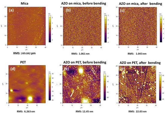 The surface morphologies and root mean square (RMS) roughness values of blank mica and PET substrates, as well as AZO-mica and AZO on PET layers as-deposited and after bending of 800 cycles, are shown in Figure 3. Freshly cleaved muscovite mica has a very flat surface substrate as shown in Figure 3a, a prerequisite for the growth of high-quality AZO films. The surface roughness of AZO-mica (Figure 3b) does not change significantly after the bending test (Figure 3c). However, the surface roughness of AZO on PET (Figure 3e) increased almost two-fold, presumably due to the surface deformation during bending (Figure 3f).