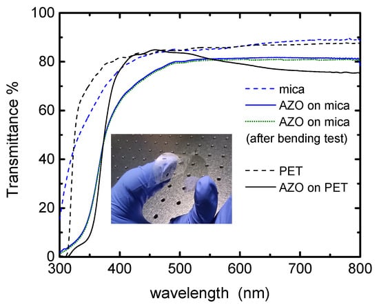 We measured the transmittance spectra of AZO on mica and AZO on PET films after completed bending cycles and found there is no change in optical spectra. The data are presented as a dotted line for AZO on mica film for illustration purposes only.