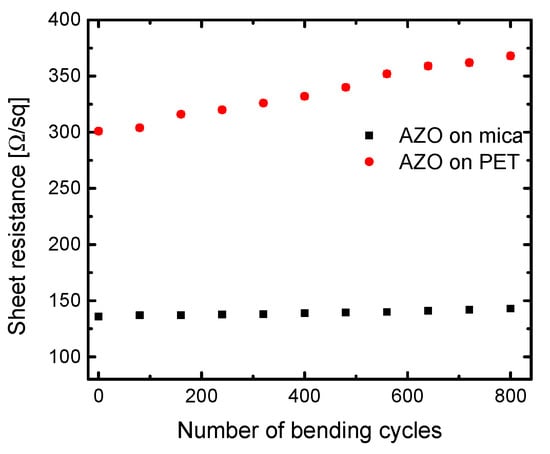 The current vs. voltage (I–V) characteristics of AZO film on mica are presented in Figure S1 which confirms Ohmic behavior. Figure 5 shows that AZO on mica exhibits higher conductivity than AZO on PET, assumed to be due to the higher deposition temperature and improved crystallinity of the AZO film [33]. To verify the stability of AZO on mica against mechanical bending, a cycling bending test was performed (see Figure S2) As shown in Figure 5, the sheet resistance of AZO on mica remains almost constant, even after continuous bending of up to 800 times with a bending radius of 1.5 mm. It is supposed the stability is due to the unique layered structure of mica and flexibility of the AZO films. In contrast, the sheet resistance of AZO on PET monotonously increases with the number of bending cycles. As shown in Figure 3f, the RMS data of AFM suggested some deformations (cracks) during the bending test of AZO on PET causing probably breaks in the conductivity channels, i.e., the sheet resistance increases with bending cycles.