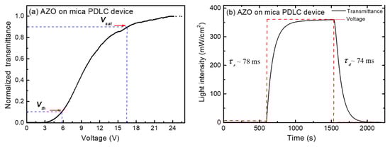 Here, we defined the threshold voltage, Vth, as an applied voltage value required to reach 10% of the maximum transmittance T (T10%), e.g., to turn on the PDLC cell. Subsequently, the saturation voltage, Vsat, is the applied voltage value, required to reach 90% of the maximum transmittance T (T90%). The measured threshold voltage, Vth, of AZO on the mica PDLC device is around 5.8 V, and the saturation voltage, Vsat, is around 16.6 V (Figure 7a). These values are slightly better than the results presented at [26] for PDLC devices using AZO on PET.