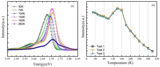 (a) The photoluminescence spectra at typical temperature of sample A; and (b) the normalized temperature-dependent integrated Photoluminescenceintensity of three repeated tests of sample A.