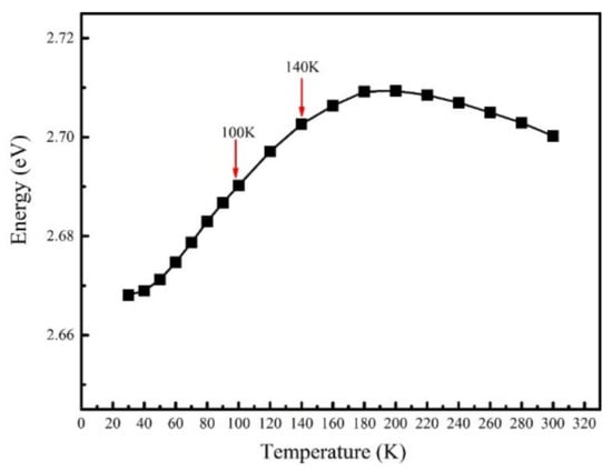 One possible explanation is that the extra carriers are transferred from shallower localized potential centers to deeper localized potential centers [20,21]. It is well known that deeper localized potential traps can screen dislocation and other defects more effectively, improving the carrier radiative recombination efficiency. Note that this explanation is based on the carrier transfer process from shallower traps to deeper traps, which means the red shift of the PL emission peak [14]. To check that, the curves of PL emission peak energy as a function of temperature for samples A are shown in Figure 2. It can be found that, contrary to the redshift, the peak energy has a significant blue shift from 2.69 to 2.70 eV between 100 and 140 K, which means a transfer process of carriers from deeper traps to shallow traps. Such a contradiction suggests that the transfer process may not be the main reason to this intensity enhancement phenomenon. In addition, the trend of blue shift is slowing down after 160 K, which is related to anomalous increase of luminescence intensity, which will be discussed below.
