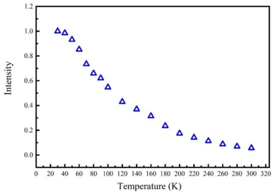Another more reasonable interpretation is that the extra carriers come from the quantum barriers (QBs) since a 325 nm laser is used as the excitation source and a similar phenomenon has been observed in previous work [22]. The photon energy of 325 nm laser is higher than the barrier band gap; thus, extra carriers can be excited in the barrier layers and then dropped into quantum wells. A simple but effective method is used to confirm that the extra carriers come from the QBs. The TDPL spectra from 30 to 300 K has been measured using a 405 nm laser as excitation light source. As is well known, the excitation energy of 405 nm laser is lower than the quantum barrier gap. It cannot excite carriers in quantum barrier layers. The integral intensity of PL spectra measured with 405 nm laser excitation are shown in Figure 3. It is found that, contrary to the anomalous increase intensity of the PL spectra measured with 325 nm laser shown in Figure 1b, a typical “thermal quenching” behavior appears in the PL spectra measured with 405 nm laser. The result demonstrates that the extra carriers participated in the radiative recombination process come from QB layers indeed. In addition, the results also indicate that the contribution of carriers generated in quantum wells (W-carriers) decreases monotonously with increase of temperature.