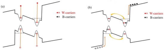 (a): The schematic diagram of the energy band of the quantum well and equilibrium distributed W-carriers; (b): the transport process of B-carriers whose distribution is non-equilibrium in space. The yellow arrows represent the carrier transport and relaxation process.