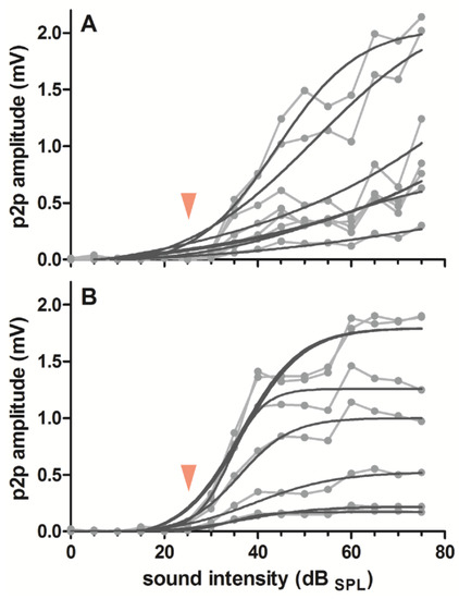 Threshold determination via input–output functions revealed similar thresholds (25 dBSPL, arrow head) for the untreated gold electrode (A) and a representative CF4/O2-etched CNT-coated ECoG electrode (B) with slight differences between electrode contacts/recording positions (N = 7). Given are the input–output functions for the LFP p2p amplitude over different stimulus intensities (noise burst: 0–70 dBSPL). Individual data (grey dots) are connected by lines (grey), and the resulting sigmoidal fit is indicted (black; goodness of fit: A: r2 ≥ 0.813; B: r2 ≥ 0.958).