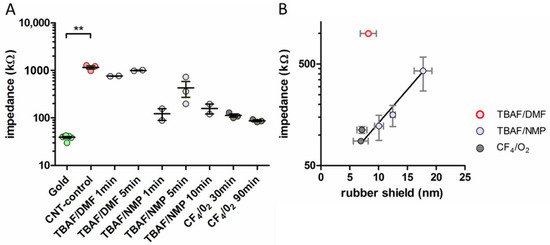The un-etched electrode coated with CNT-silicone rubber (CNT-control) showed significantly higher impedances (mean: 1160.02 kΩ) in comparison to the untreated gold contacts (mean: 39.27 kΩ; Kruskal–Wallis test: K = 24.90, p = 0.002, n = 9 groups; Dunn’s post-hoc test: p < 0.01). Most etched materials showed smaller impedances compared to the un-etched CNT-control electrode (Figure 5A, Dunn’s post-hoc test: p > 0.05); however, TBAF/DMF had high values (min. 753.42 kΩ) similar to the CNT-control. The lowest impedances were found for the CF4/O2-etched probes (min: 82.14 kΩ, max: 128.95 kΩ), which were still higher than the untreated gold contacts (max: 42.62 kΩ). When combining all data, the impedances of the etched electrode contacts were not significantly correlated with the thickness of the residual, insulating silicone rubber shield (Spearman correlation: p = 0.175, r2 = 0.432, n = 6; Figure 5B). However, when excluding the TBAF/DMF-treated probe that showed impedance values comparable to the insulated CNT-control (Figure 5B), the correlation was highly significant (p = 0.017, r2 = 1.000) with an exponential relation between impedance and residual rubber shield thickness (y = 28.97*e0.151x, r2 = 0.591; Figure 5B).