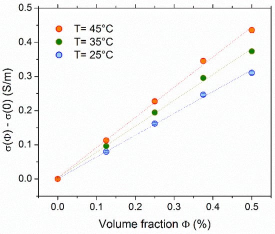 Within the low concentration range explored, the conductivity was found to be approximately a linear function of NP volume fraction. In the case of negligibly small inter-particle interactions (see Supplementary Materials for justifications), the increase, Δσ(φ) = σ(φ) − σ(0), was due to the diffusion of charged NPs and the surrounding counter-ions, and it can be expressed as: