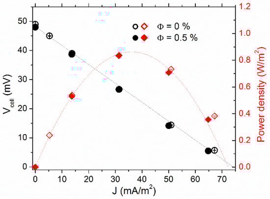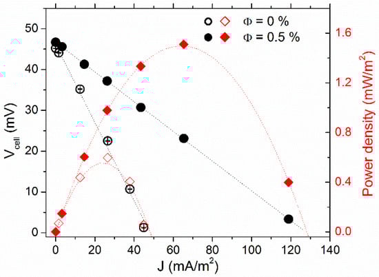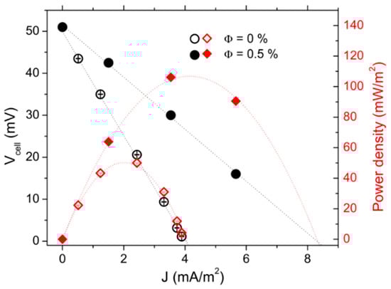 The thermocell voltage (Vcell) vs. current–density (J) curves are depicted in Figure 3, along with the cell’s power-output density (P). The Vcell was at its highest in the open-circuit configuration (J = 0). As the variable resistance load value (Rload) connected in parallel to the cell (closed-circuit configuration, see Supplementary Materials for more detail) was reduced, Vcell diminished, while the corresponding current, Vcell/Rload, increased. The Vcell-J dependency was almost linear. Thus, one can determine the experimental internal resistances (Ri) of the thermocell from the slope value accordingly: dVcell/dJ = Ri·A, where A is the electrode surface area. Ri was reduced from 34 ± 1 kΩ at Φ = 0% by a factor of 2.6 to 12.9 ± 0.1 kΩ at Φ = 0.5%, nearly the maximum power output density Pmax = J. V increased proportionally (see red curves in Figure 3).