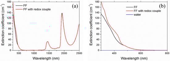 Figure 7 shows the experimental spectral extinction coefficient of the ferrofluid FF2 with and without the redox couple.