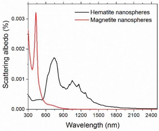 Maghemite (γ-Fe2O3) is one of the most important iron oxide polymorphs, with intermediate characteristics between hematite (α-Fe2O3) and magnetite (Fe3O4) [70]. Unfortunately, the complex refractive index of maghemite is not available in the literature. Therefore, to give an estimation of the scattering albedo, we considered both hematite and magnetite [71]. The refractive index of water was taken from [72]. Figure 8 shows the spectral scattering albedo, calculated from Equation (15), considering homogeneous spheres of 6-nm diameter and the 0.05% vol concentration. It is worth noticing that the actual size distribution of FF2 (and FF1, used for thermoelectrical characterization) was far from monodisperse, but the calculations confirmed the extremely weaker dependence of optical properties on the nanoparticle size and size distribution with respect to that on the concentration, which represents, therefore, the most important parameter here. For both the reference iron oxides and in the whole investigated spectral range, the scattering contribution results were extremely negligible and ω showed a maximum value of 0.0032 for magnetite and 0.0017 for hematite. For this reason, in the rest of this paper, we will refer to extinction and absorption as equivalent words.