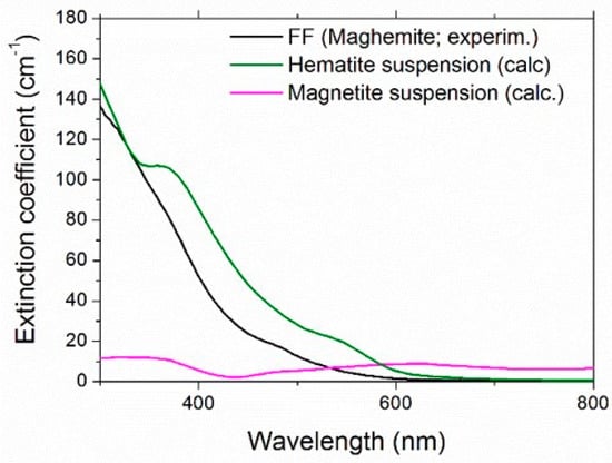 Comparison of experimental extinction coefficient of the maghemite sample and the calculated one for aqueous suspensions of hematite and magnetite.