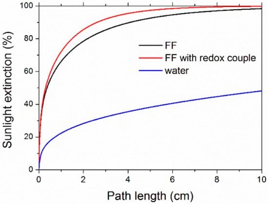 The sunlight extinction fraction, calculated according to Equation (6), is shown in Figure 10 for ferrofluids and water. Sunlight was absorbed by 90% after a 2.62-cm propagation path in the sample with the redox couple, while the pure ferrofluid needed 4.10 cm for the same level of sunlight absorption. For comparison, water reached about 48% only after a path as long as 10 cm.