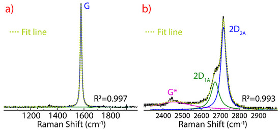 The Raman spectrum of natural graphite is shown in Figure 1. The main feature is the first order spectrum displaying the E2g in-plane optical mode (commonly called G peak) at 1577 cm−1 (Figure 1a). This narrow G peak appears due to the bond stretching of all pairs of sp2 hybridized carbon atoms in both rings and chains [41]. The G* peak found at 2447 cm−1 is characteristic of graphitic materials. The 2D peak appears at 2720 cm−1, characterized by two bands (Figure 1b), the intense 2D2A band at 2720 cm−1, and a less intense 2D1A band at 2677 cm−1. These bands are originated due to the splitting of π electrons as an effect of the interaction between stacked graphene layers.