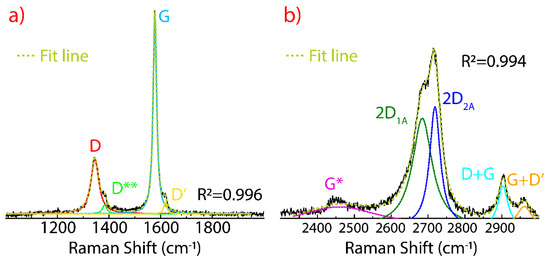 Interestingly enough, the 2D band region (Figure 3b) is characterized by intense 2D1A and D+G bands and a less intense 2D2A band in contrast to those observed in natural graphite (Figure 1b) and FLG (Figure 2b). The intensity ratio I2D2A/I2D1A = 0.22 in GO decreases about 12 times and 5 times compared to graphite and FLG, respectively. These outcomes are probably due to a good chemical exfoliation and reduction of the number of layers, but the resulting material has sufficient defects to activate the D, D’, D**, and D+G bands.