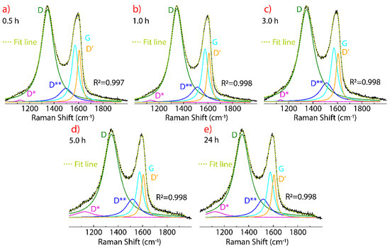 As seen in Figure 5, the relative intensity of the D’ (blue line) and G (orange line) bands shows a constant trend, while the D* (green line) and D** (magenta line) display a square-root-like dispersion. From the curve fitting, it can be seen that the most significant effect of drying time is ≤10 h. These outcomes show that it is not possible to transform GO into reduce graphene oxide (rGO) through drying time at 80 °C. Nevertheless, if it is possible to increase the density of sp3-type and hopping-like defects associated with the presence of the D* and D** band, respectively.
