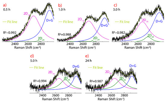 Raman spectra of GO from 2300 to 3000 cm−1 recorded using 532 excitation laser, subject to 80 °C, and considering different drying times: (a) 0.5 h, (b) 1 h, (c) 3 h, (d) 5 h, and (e) 24 h. The intensity was normalized by the most intense peak and the fitting of the peaks using Lorentzian functions.