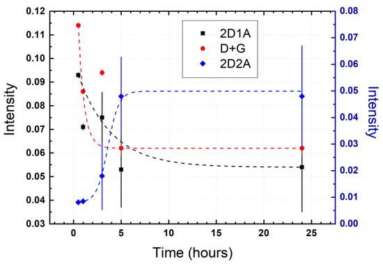 Intensity of the 2D1A, 2D2A, D+G peaks as function of the drying time (0.5 h, 1 h, 3 h, 5 h, 24 h). The maximum intensity was obtained from the fitting using Lorentzian functions.