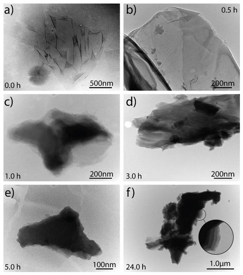 TEM analyses of GO subject to 80 °C and considering different drying times: (a) 0.0 h, (b) 0.5 h, (c) 1.0 h, (d) 3.0 h, (e) 5.0 h, and (f) 24 h.
