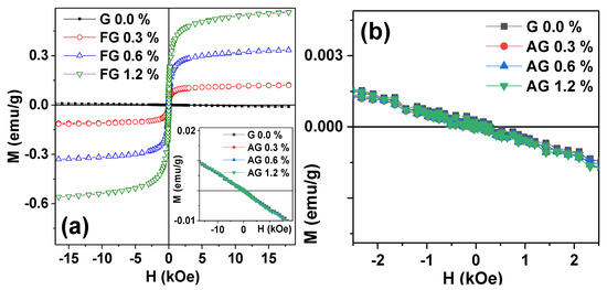 Figure 4 gives the comparison of magnetic properties of gel-based composites with MNPs and ANPs. An appropriate scale helps to visualize the difference in the best way. One can see that, as expected for the mainly water containing sample, hydrogel (G 0.0%) had quite a weak diamagnetic signal, which was much lower than the signals of MNPs in the concentrations under consideration.
