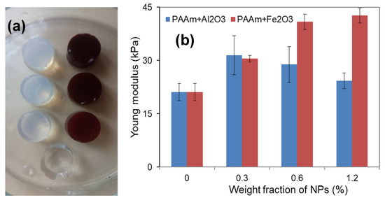 Figure 5 shows the general view of the gel-based composites with different content of the embedded NPs (Figure 5a) and the effect of iron oxide or aluminum oxide NPs concentration on the value of Young’s modulus in the PAAm gels (Figure 5b). One can see that the addition of particles at a minimum concentration (0.3%) to the polymer network resulted in a significant increase in the composite rigidity. Moreover, the contribution of MNPs or ANPs to the modulus at the lowest concentration in the gel network was approximately the same.