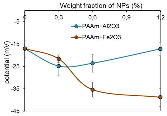 Dependence of electrical potential in gels on the concentration of Fe2O3 or Al2O3 nanoparticles. Data presented as mean value and SD bar (n = 7).