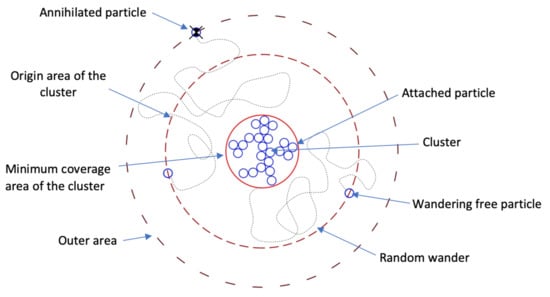 The schematic concept of the DLA growth algorithm with a minimum specified coverage area.