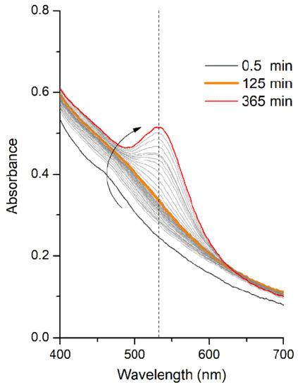At first, seeds were synthesized, and the obtained time-resolved UV–VIS spectra investigated, for assessing within which period they are applicable for the next stages. The color of the reaction mixture changed from pale yellow to brown instantly after the injection of NaBH4 due to its high reactivity. Further changes in optical properties could only be resolved with UV–VIS spectrometry, the data of which are shown in Figure 1; a 3D visualization can be found in Figure S2. The last spectrum was measured at 365 min after the reaction start. In this curve, the LSPR peak can be found at 532.5 nm, demonstrating the formation of spherical particles with a diameter of more than 2 nm [42,43]. Seeds smaller than 2 nm in diameter do not show the LSPR band in the UV–VIS spectrum and are preferable for the synthesis, while the use of larger seeds may affect the synthesis efficiency [44,45,46,47,48,49]. Therefore, the pronounced LSPR peak represents an indicator of an undesired seed overgrowth, and the next stage of the synthesis should be carried out before it occurs. The values of A400 correlate with Au0 concentration [25,50] and, therefore, serve as a tool for tracing the NP formation process from Au3+ precursor.