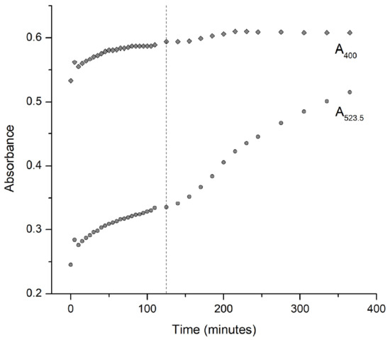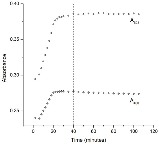 The kinetic curves for two positions in UV–VIS spectra: absorbance at 400 nm (Au0) and at 523 nm (spheres ca. 10 nm in diameter). The dashed line indicates the growth process completion 40 min after the reaction start.