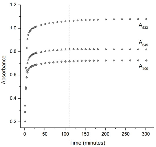 Taking into the account the above-mentioned statements, the kinetic curves presented in Figure 2 were plotted using two spectral positions: absorbance at 400 nm and at 532.5 nm. Within 2 h, the intensity at these wavelengths increased from 0.533 to 0.594 and from 0.245 to 0.335, respectively, pointing to the formation of seeds. After 125 min, the A400 values did not change significantly, confirming that the HAuCl4 in the reaction mixture had been completely reduced to form the nanoparticles. On the other hand, an increase of A532.5 values up to 0.515 started to occur at the same time, indicating an overgrowth of seeds caused by their coalescence, which should be minimized for optimal synthesis results.
