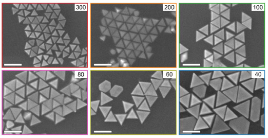 SEM images of purified gold nanotriangles synthesized after the time-optimized procedure. Labels indicate the volume (μL) of intermediate seeds used for each sample. Scale bars are 100 nm.