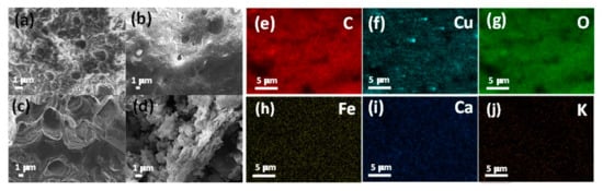 Scanning electron microscopy (SEM) micrographs of (a) Cu-Fe@OP100 °C, (b) Cu-Fe@OP200 °C, (c) Cu-Fe@OP300 °C, and (d) Cu-Fe@OP400 °C samples. SEM-mapping analysis of Cu-Fe@OP200 °C sample for (e) carbon, (f) copper, (g) oxygen, (h) iron, (i) calcium, and (j) potassium.