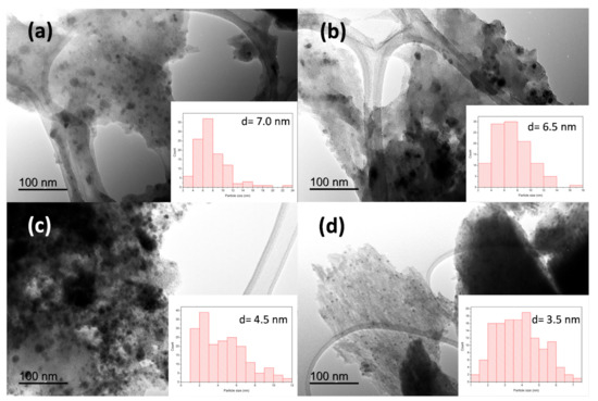 TEM analysis of the samples revealed the formation of well-dispersed spherical nanoparticles embedded in a carbon matrix (Figure 3). The nanoparticles exhibited a main diameter lower than 10.0 nm for all the samples, as can be observed in TEM micrographs and in the inset histograms (Figure 3a–d). Interestingly, the temperature of the thermal treatment had a noticeable influence on the particle size distribution, going from a wide distribution for the sample treated at 100 °C, to a narrow distribution with a smaller particle size (3.5 nm) for the material calcined at 400 °C (See Figure 3d).
