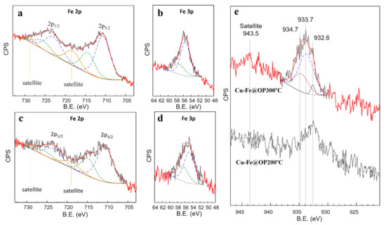 The curve fitting of Fe2p and Fe3p core levels from XPS results of both Cu-Fe@OP200 °C and Cu-Fe@OP300 °C samples (Figure 4a–d) are consistent with the contribution of Fe2+ and Fe3+ species within the ranges of 68.5–73.2% and 26.8–31.5%, respectively. The analysis of the Fe2p region for the Cu-Fe@OP300 °C and Cu-Fe@OP200 °C catalysts showed the contribution of two different components for both Fe2p1/2 and Fe2p3/2 resolved signals, along with the characteristic satellite, at 5 eV and 8 eV above each core level maximum, respectively [30]. Focusing on the Fe2p3/2 signal, conventionally employed to determine the Fe2+/Fe3+ ratio [31,32,33], the two components appear at 710.67 eV (Fe2+) and 714.64 eV (Fe3+), with a standard deviation < 0.03 eV in both. The respective FWHM values, 4.09 eV and 4.38 eV (standard deviation < 0.2 eV), are characteristic of a broadening associated to unresolved multiplet splitting [34].