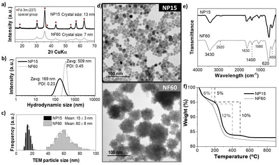 Iron oxide nanoparticles (NP15 and NF60) characterization. (a) X-ray diffractogram, (b) hydrodynamic size, (c) particle size distribution and log-normal fitting, (d) TEM images, (e) FTIR transmittance spectra, and (f) thermogravimetric analysis.