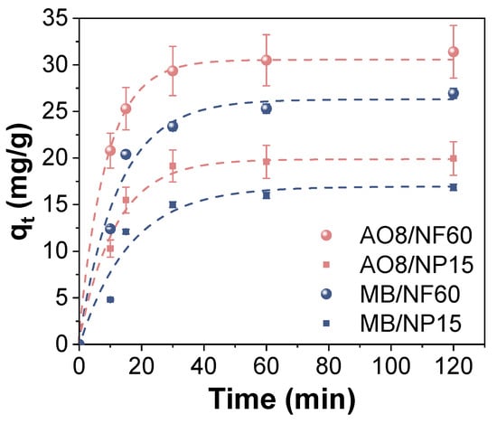 The adsorption kinetics of the AO8 and MB using NP15 and NF60 were studied first. The adsorption capacity at equilibrium was obtained for different pH values, see Figure S4. For AO8, the pH where the adsorption process was most efficient was 3.5, agreeing with other reported results, while MB increased with pH but not in a significant manner. Therefore, and for comparison purposes, a pH value of 3.5 was selected to analyze the effect of adsorption time and to determine the time required to saturate the samples. Figure 4 shows the kinetics obtained for both samples in AO8 and MB solutions. A pseudo-first-order kinetic model was fitted to the experimental data showing good agreement with all of them (R2 > 0.98). This kinetic model usually fits well to this kind of environmental processes and indicates that chemisorption is the most likely mechanism of adsorption with the surface adsorption as a rate-limiting step []. Moreover, as it can be seen at 60 min of adsorption, all the samples reached the equilibrium. NF60 is a more efficient adsorbent for AO8 and MB, which can be attributed to the better textural characteristics of this sample, as mentioned before (Table 2 and Figure S2). In light of these results, degradation studies were performed after 2 h of agitation to ensure that the system had reached the equilibrium.