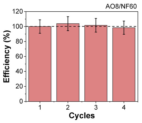 To date, the full potential of MIONPs as catalysts in different processes has not been completely evidenced. By taking advantage of this material’s heating capacities, it is possible to provide more efficient heating, leading to the improvement of different temperature dependent reactions. As shown in the presented results, by subjecting these particles to an AMF, it is possible to increase the surface temperatures while quickly raising the degradation efficiencies without having to wait for the medium to be fully heated. Therefore, it was possible to endorse the significance of these results by comparing them with the latest related research focused on degradation of AO8 and MB with magnetic nanomaterials. Among these works, and to the best of the authors’ knowledge, there is not a single one improving the efficiency of the AO8 degradation with magnetic induction heating of MIONPs while for MB, there is a single study where the improvement of the degradation with MIONPs obtained by electrochemistry is reported []. Another single study shows that the efficiency of degradation can be enhanced for emerging pollutants too, reaching 100% yields in shorter times (15 min) in solutions of 5 ppm of persistent antibiotic sulfamethoxazole, 25 mg/L of H2O2, and 1 g/L of magnetite catalyst. []. As this is an emerging subject, there are already some studies considering other approaches of magnetically induced remediation processes using different pollutants and materials. Phenrat C et al. showed that the degradation rate constants of the chlorinated dense non-aqueous phase liquid can be increased up to ≈60 times with magnetic induction heating of a nanoscale zerovalent iron catalyst (87 °C). In addition, Chen et al., using an induction reactor with a carbon-coated Fes magnetic catalyst, showed that the heating coming from this material can rise temperatures in a much efficient manner (up to 60 °C) allowing higher yields in the catalytic wet peroxide oxidation of direct blue, direct violet, and direct scarlet []. All of the mentioned studies, like the present one, were able to achieve a 100% degradation of a specific pollutant, but the most remarkable outcome is that the transference of energy occurs directly from the catalyst interface rather than the aqueous phase. This kind of process can be catalogued as more efficient speaking from a thermal point of view []. Moreover, the degradation of AO8 using the most efficient catalyst (NF60) showed a 100% efficiency for up to four cycles of reuse (Figure 6).