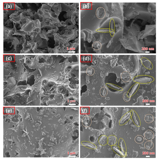 An increase of molybdenum content reveals an increased tendency of both agglomerated nanoparticles and nanoplates morphologies as highlighted in circles in Figure 4b,d,f (high magnification). These two different morphologies are perhaps due to the presence MoO2 and Mo2C in the composites, but it is not easy to identify which of these belongs to a specific morphology.