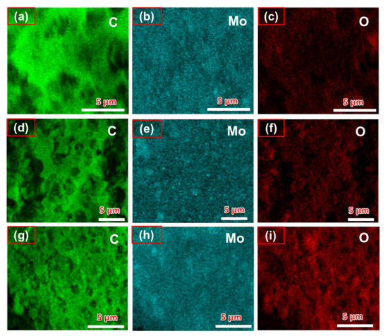 EDX mapping was also applied to determine the elemental distribution of the PAC/MoO2/Mo2C-0.5, PAC/MoO2/Mo2C-1 and PAC/MoO2/Mo2C-2 ternary composites as seen in Figure 5a–i. It is observed that the Mo, O and C elements are uniformly distributed throughout the interconnected porous carbon structure. This suggests that the agglomerated nanoparticles and nanoplates were composed of MoO2 and Mo2C embedded into the carbon matrix.